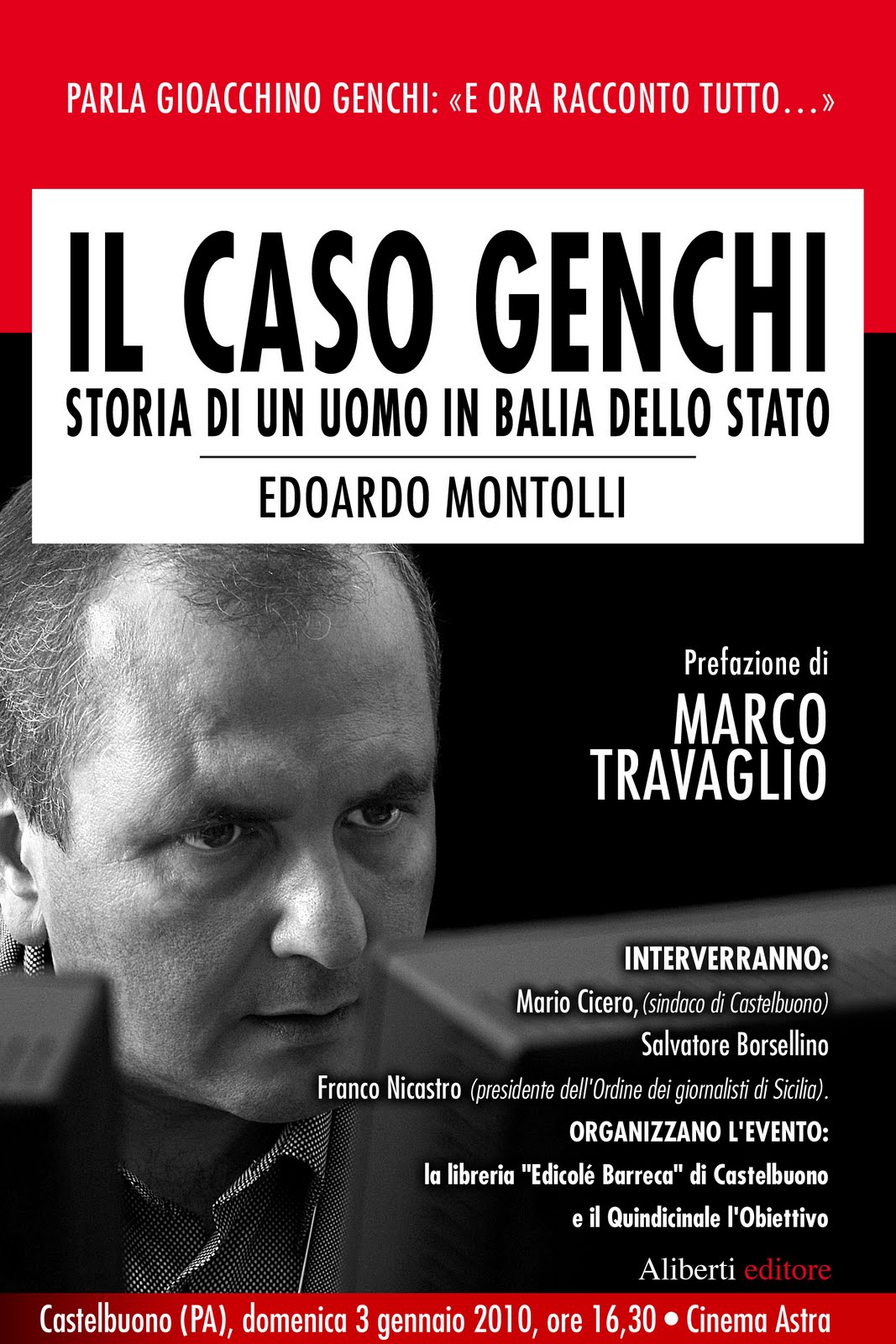 La libreria “Edicolé Barreca” di Castelbuono (Palermo) ed il quindicinale l’Obiettivo sono lieti di invitarvi alla presentazione del libro Il caso Genchi: storia di un uomo in balia dello Stato di Edoardo Montolli, edito da Aliberti. Parteciperanno all’incontro Gioacchino Genchi, Mario Cicero (sindaco di Castelbuono), Salvatore Borsellino e Franco Nicastro (presidente dell’Ordine dei giornalisti di Sicilia). La presentazione avrà luogo domenica 3 gennaio alle ore 16.30 presso il cinema Astra a Castelbuono.